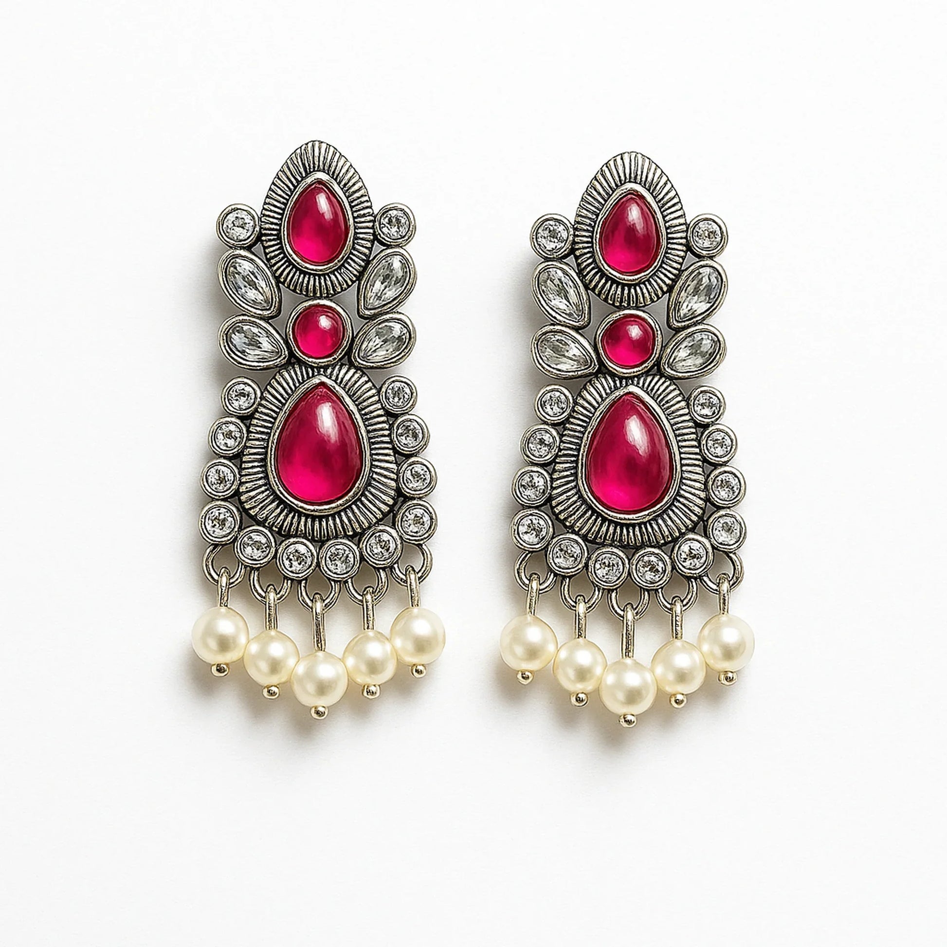 Tired of earrings that tarnish, feel heavy, or don't capture the authentic beauty of traditional Indian craftsmanship? These oxidized pink blossom danglers with pearl drops solve all those problems – giving you heritage elegance, comfortable wear, and the confidence that comes with wearing something truly magnificent.